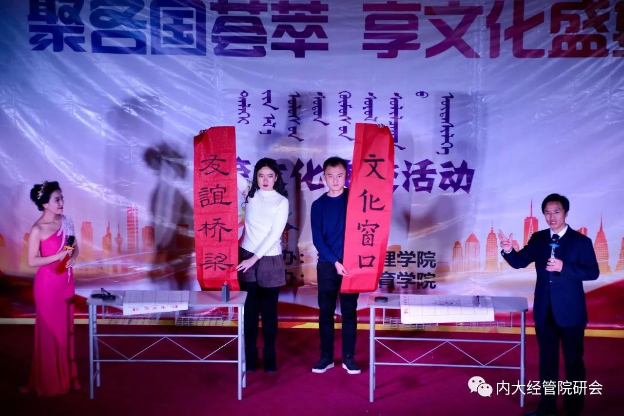 为了让留学生更加了解中国的传统文化,本次活动还特别准备了书法互动环节。书法是中华民族古老且具有代表性的艺术,传承至今,新的时代已经赋予了它更多样的形式。孙亚菲与王丹宇两位同学现场书写出“文化窗口”、“友谊桥梁”八个大字,同时,张士伟书记现场为大家讲解了书法文化的基本知识与内涵。