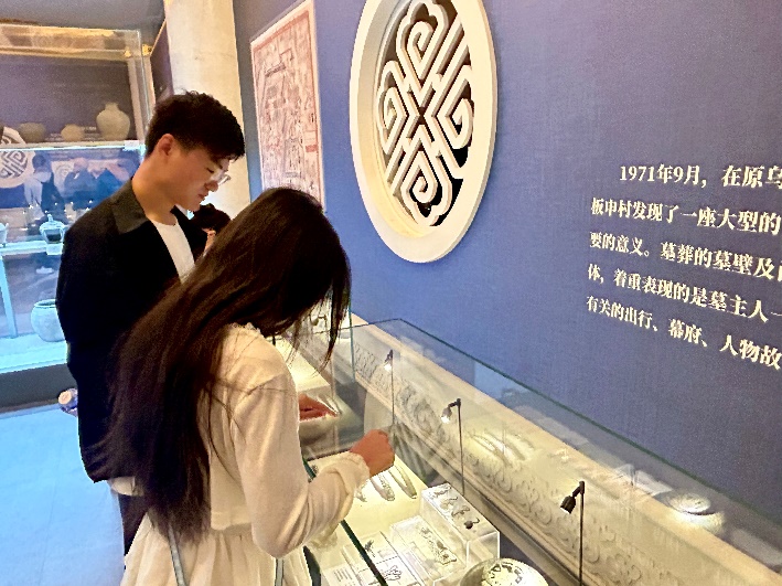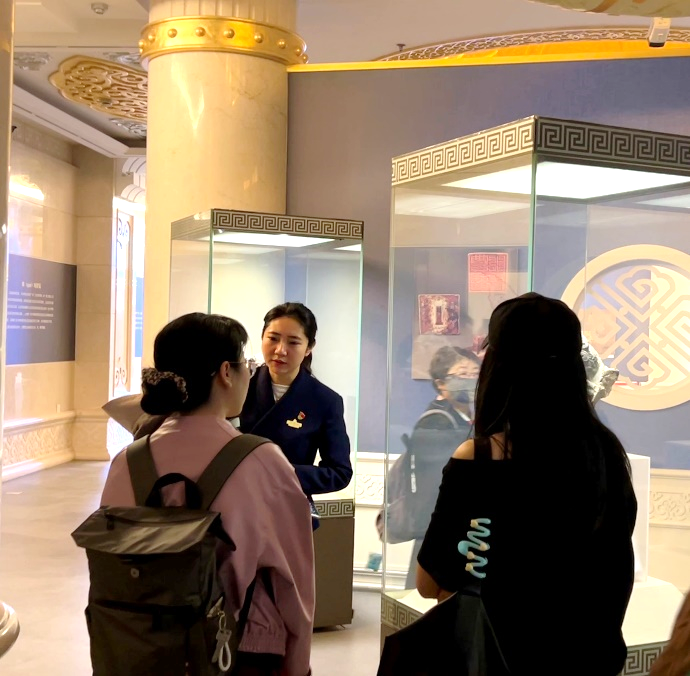 在讲解员的带领下,党员们参观了《历史文化名城—呼和浩特》、《呼和浩特召庙壁画艺术展》等特色展览。鲜卑族的北魏双羊五轮金饰牌、融合多元文化的辽菩萨头像、见证经济交往的元中统元宝交钞等珍贵文物,生动展现了各民族共同创造的历史文化。讲解员特别提到:“这些文物不仅是历史遗存,更是各民族交往交流交融的实物见证,彰显了中华文化的包容性与多样性。”