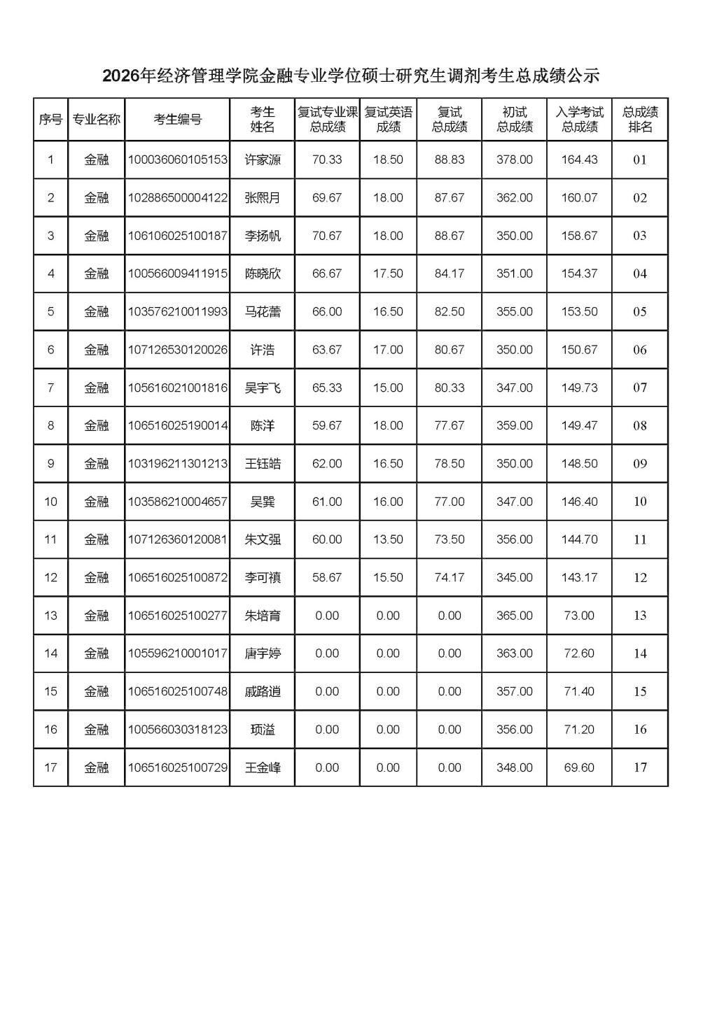 2026年yl7703永利集团金融专业学位硕士研究生调剂考生总成绩公示