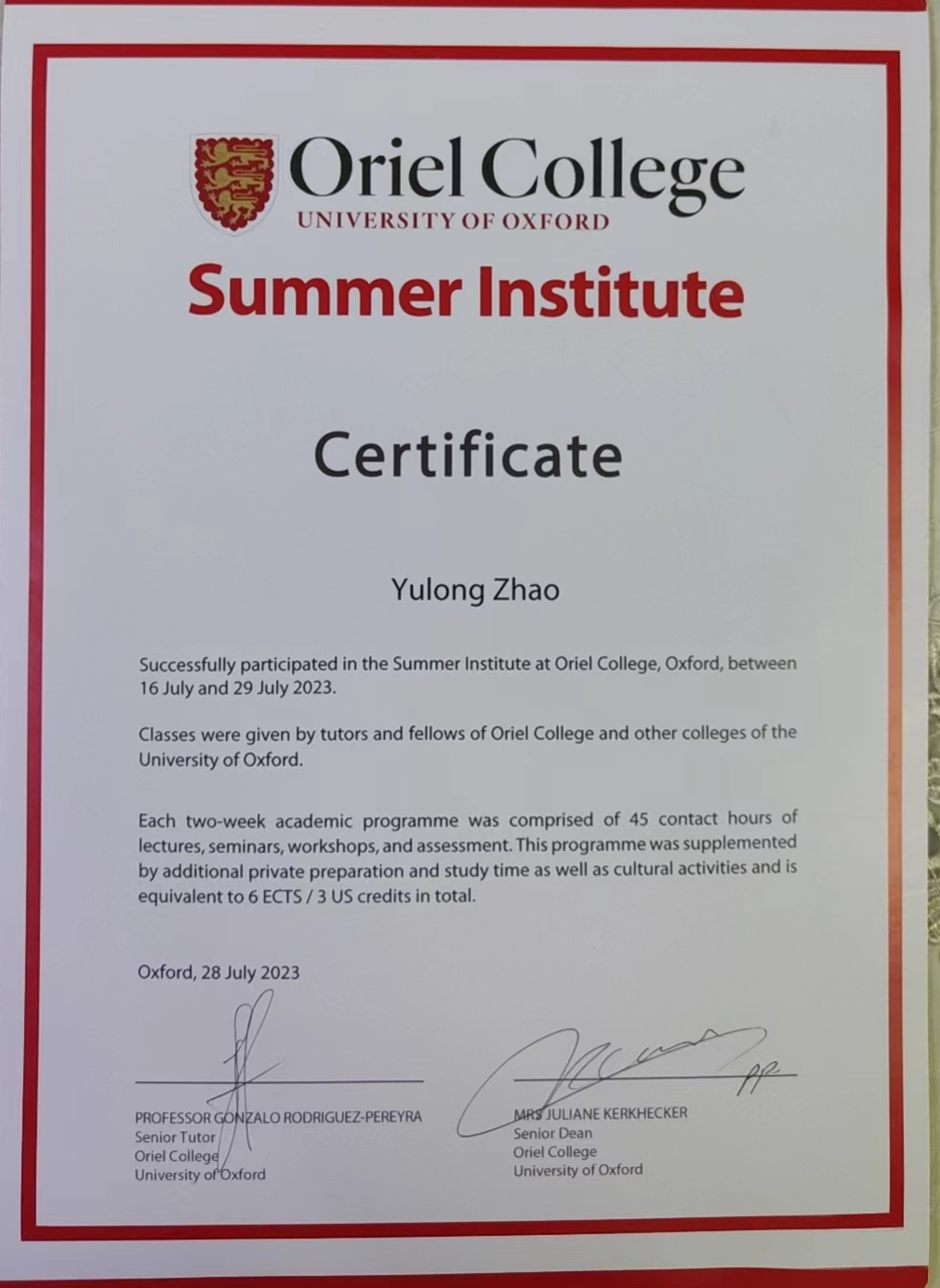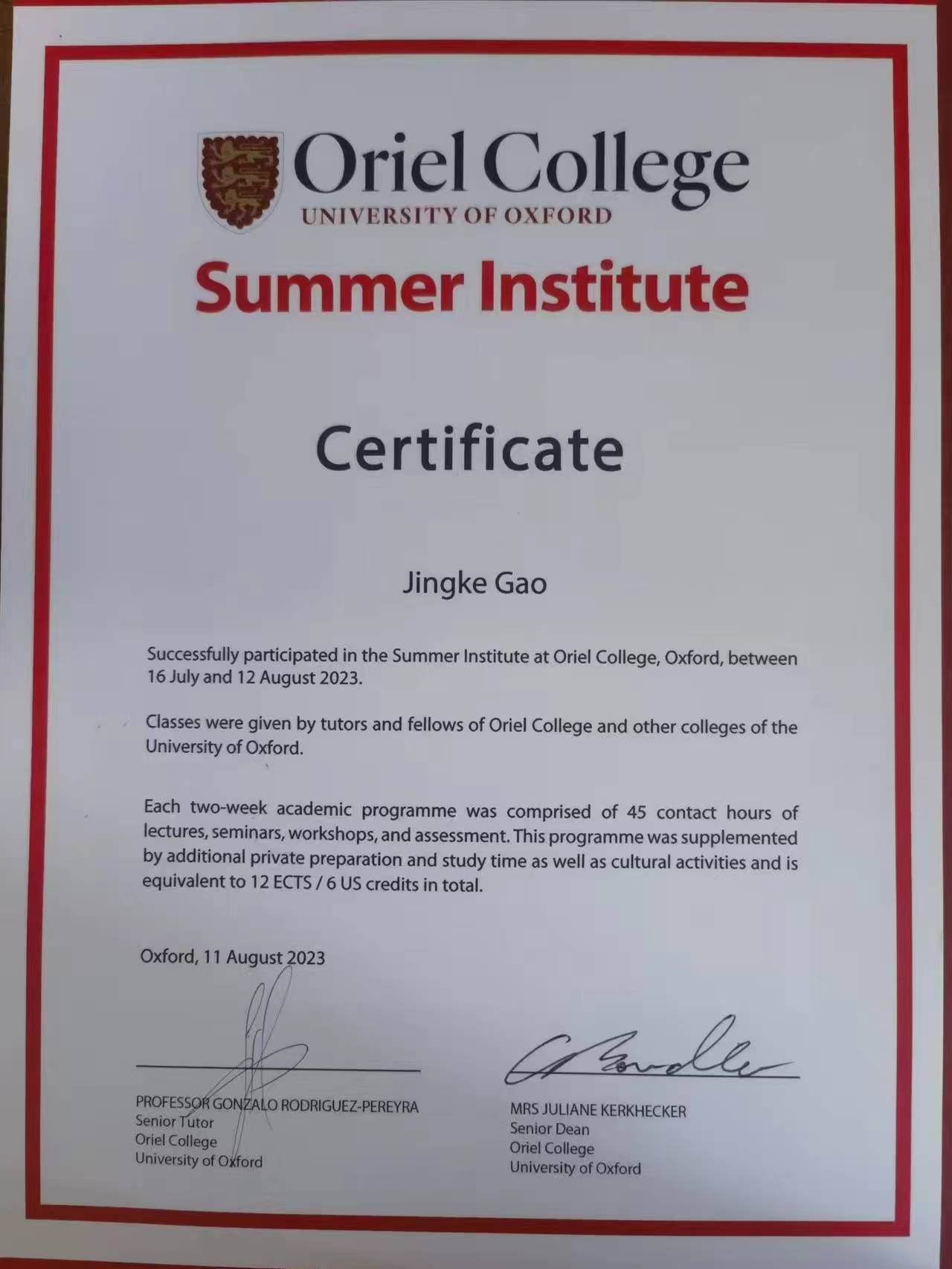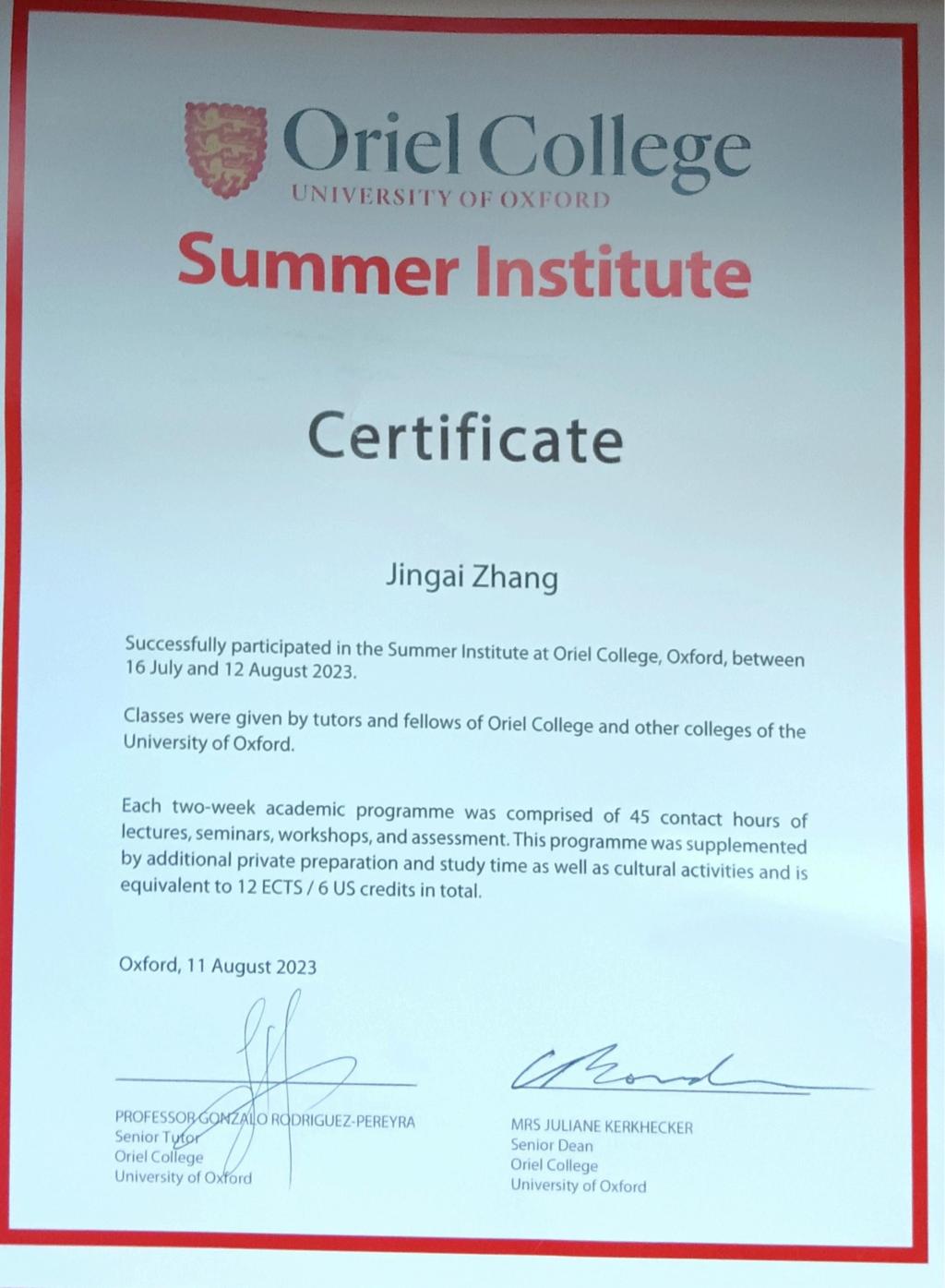 9名访学学生具体修读课程情况是:5名学生选了《Economics of Public Policy》;3名学生选了《Economics of Public Policy S》和《Knowledge and Reality》;1名学生选了《Knowledge and Reality》和《Introduction of Finance》。学生通过加强与教授和同学的交流沟通,克服语言恐惧,精进学业,逐渐适应了牛津访学生活,最终全部取得课程合格证书。牛津大学学分按1.5 ECTS/3 US credits认定(ECTS,European Credit Transfer System欧洲学分互认体系,是欧洲各个国家间在高等教育领域互相衔接的学分系统),永利官网学分转换办法按已报备学校教务处的《内蒙古大学yl7703永利集团本科生赴牛津大学奥利尔学院暑期访学学分认定办法》执行。