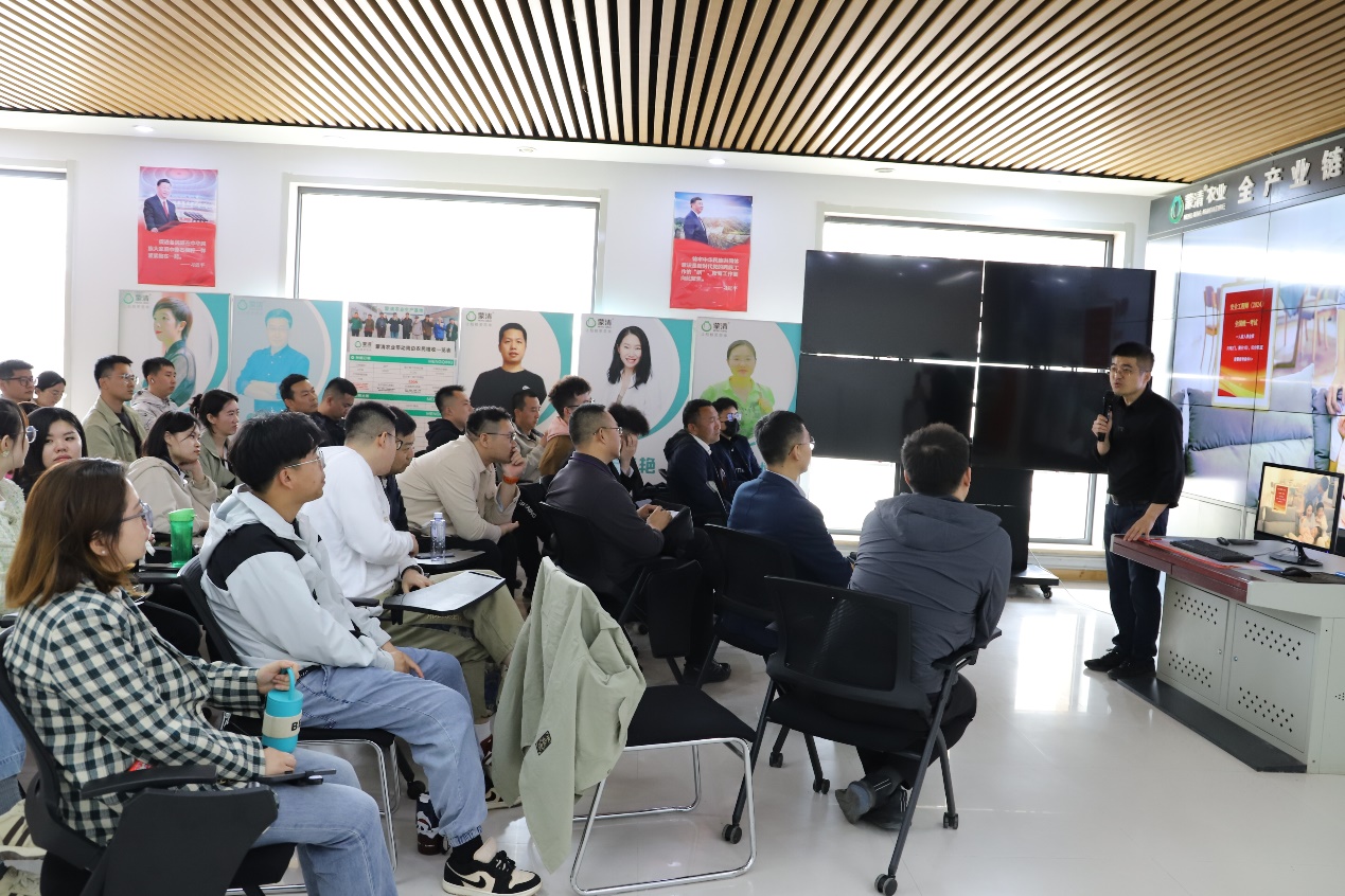 接着黄总为2023级A班师生讲授了《营销管理》课程。他在介绍蒙清农业十几年的发展历程中详细介绍了蒙清农业的产品、产业线的相关情况,然后结合蒙清农业发展战略及营销策略的实际运作等讲授了蒙清农业对于营销的理解。课后,A班同学积极提问,和企业教师共同探讨企业发展中关于营销方面遇到的问题及解决方向。最后,《营销管理》主讲教师黄小葵副教授对课程作了总结,她说,来蒙清农业的参访学习,大家走进真实工作场景,建立起学习与生活、知识与应用的联系,让课堂知识活起来,相信大家都受益匪浅。