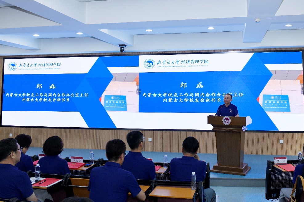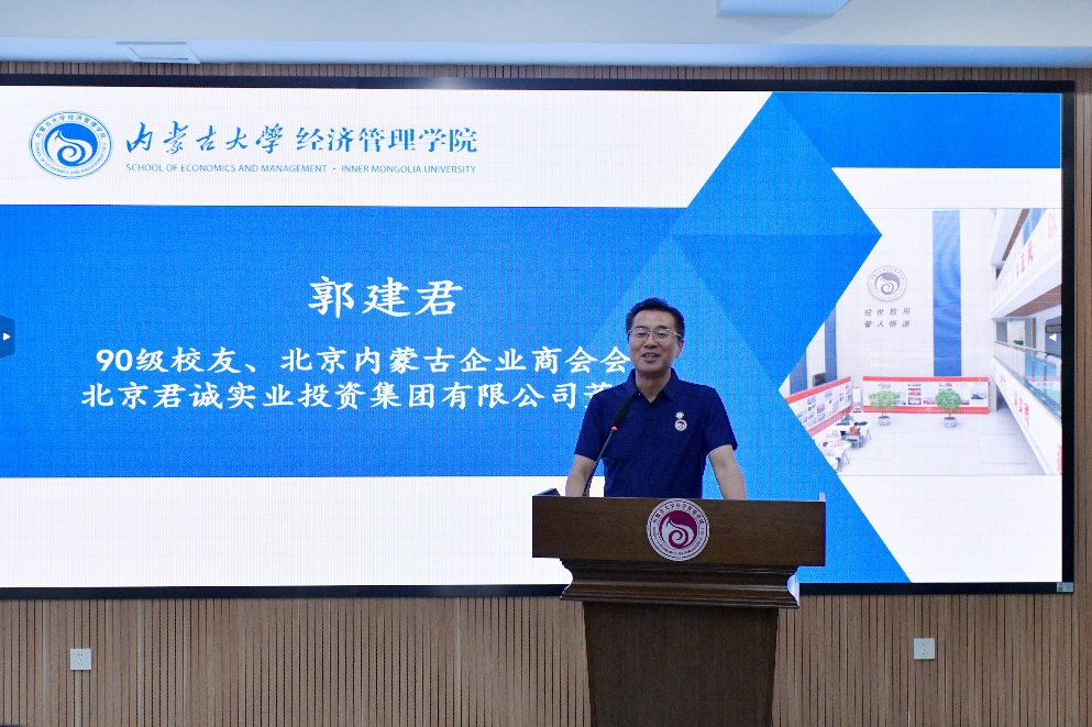学院1990级校友、北京内蒙古商会会长、君诚实业集团董事长郭建君代表广大校友致辞,表达了对母校、对学院的深厚情谊,并表示将为学院的事业发展积极贡献校友力量。
