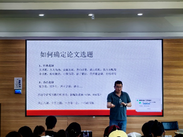 为全面落实“一支部一品牌”建设,切实提升研究生科研能力,经济学研究生党支部于2025年5月15日下午,在知行楼(经管楼)409教室, 组织开展了“骏马人才”讲科研系列主题党日活动。首期讲座邀请到学院“骏马计划”研究员陈文作了《经管类学术论文选题及期刊遴选》的报告,支部全体党员及学院部分研究生参加了活动。