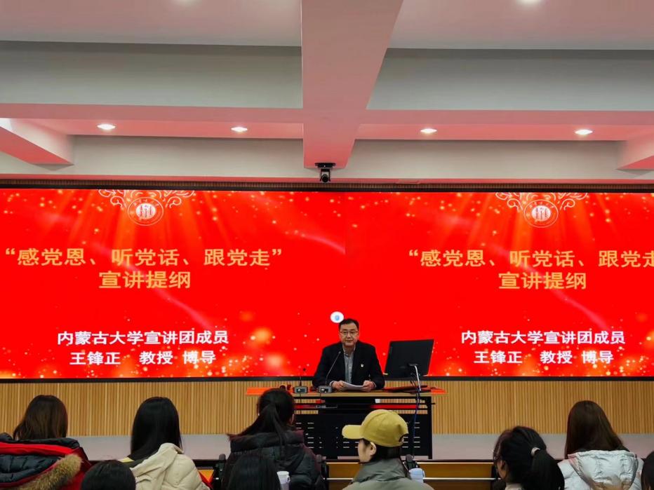 为深入学习贯彻习近平新时代中国特色社会主义思想,落实习近平总书记对内蒙古的重要指示精神,yl7703永利集团于2023年12月7日19:00在知行楼116报告厅开展了“感党恩、听党话、跟党走”主题宣讲会。学院党委副书记、副院长王锋正作宣讲报告,学院全体学生党员聆听了报告。