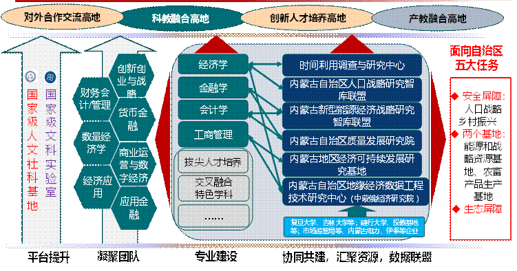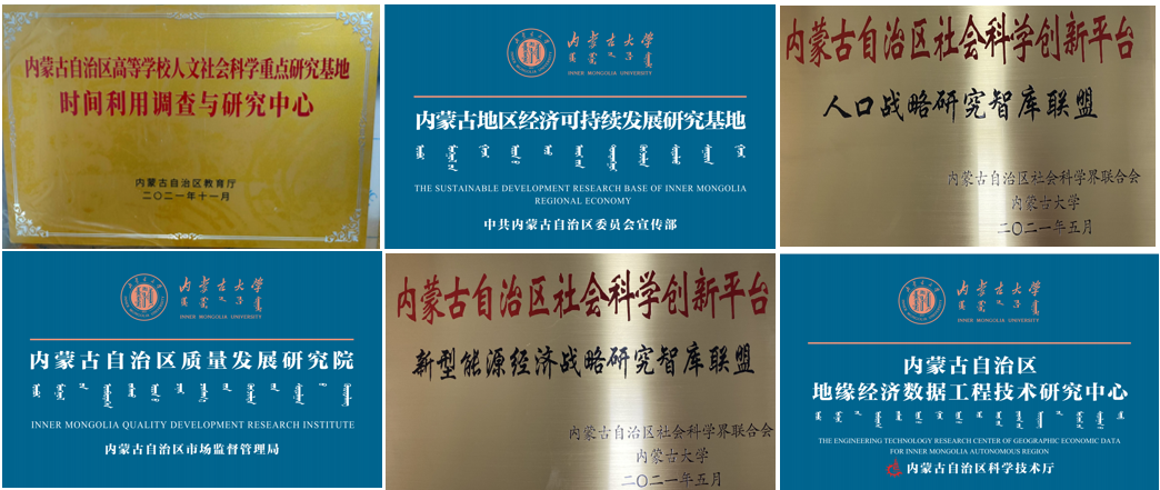 学院着力建设内蒙古自治区哲学社会科学重点研究基地—内蒙古地区经济可持续发展研究基地、内蒙古自治区高等学校人文社会科学重点研究基地—中国时间利用调查与研究中心等6个自治区级科研平台和中蒙俄经济研究院等6个校、院级科研平台;与西南财经大学等高校共建中国高校数据联盟,与乌拉尔联邦大学共建中俄行为经济学联合实验室,与复旦大学等高校共建中国国家能源基地绿色化数字化双转型发展智库联盟、与复旦大学共建能源与碳中和战略研究院。