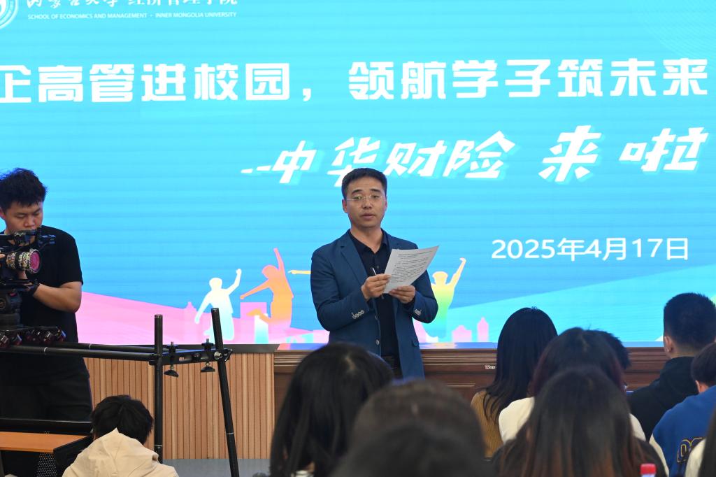 为深化产教融合协同育人机制,帮助学生把握行业发展趋势、提升职业规划能力,2025年4月17日下午,yl7703永利集团在知行楼(经管楼)116报告厅,举行了“名企高管进校园·领航学子筑未来”保险行业知识讲座。本次讲座特邀中华财险内蒙古分公司党委委员、总经理助理杜义欣担任主讲嘉宾,中华财险内蒙古分公司团体及重要客户部负责人杜娟、人力资源部招聘专员宋哲以及校园大使共同出席。讲座由学院党委委员、副院长周瑜主持,吸引了学院近百名学生参加。